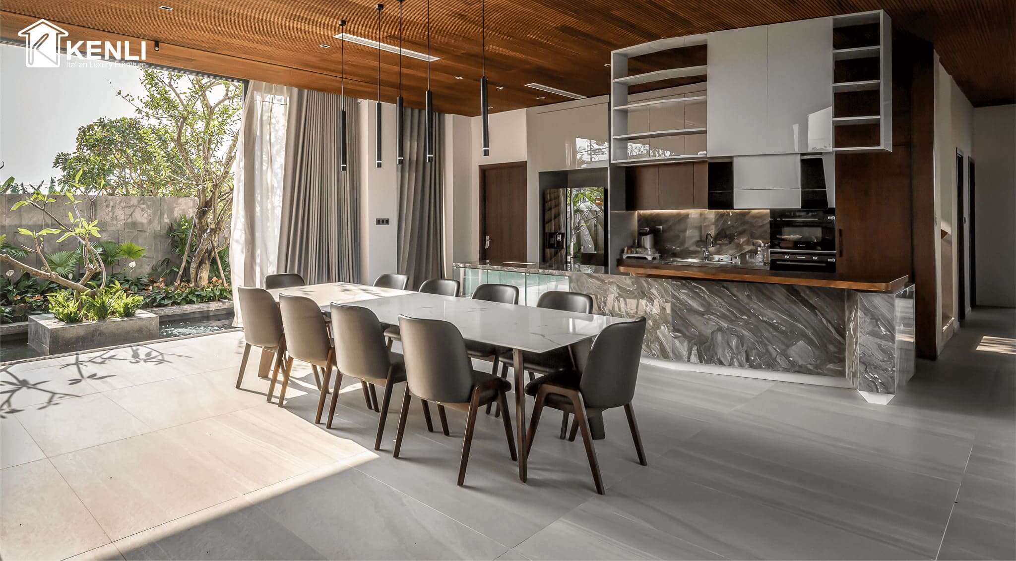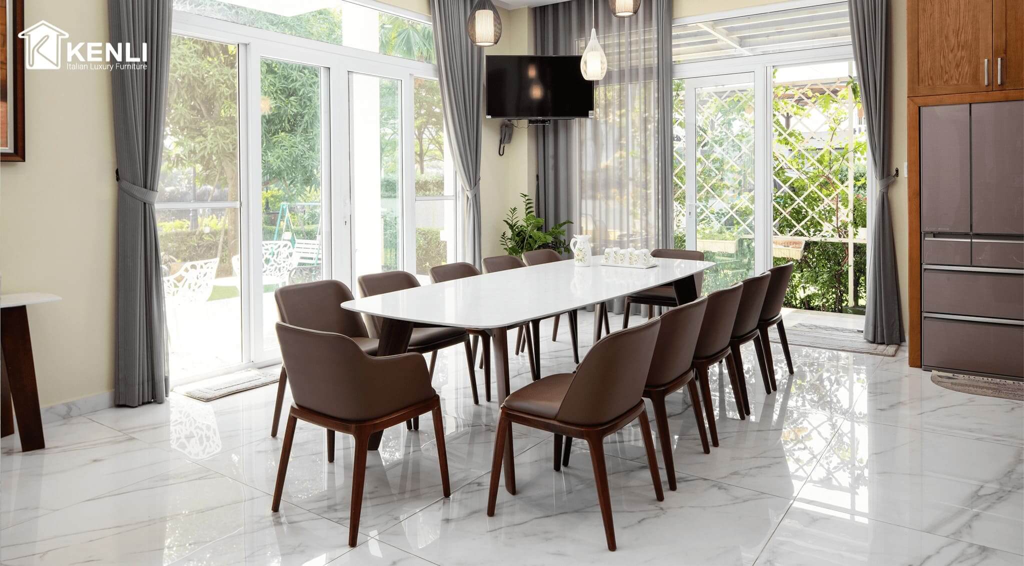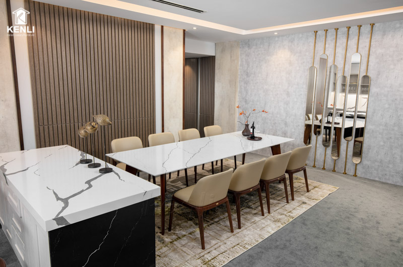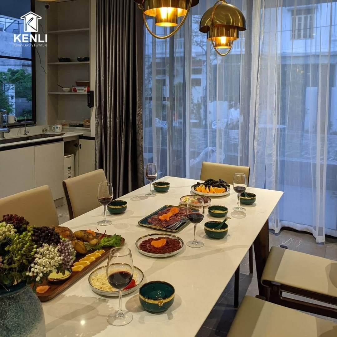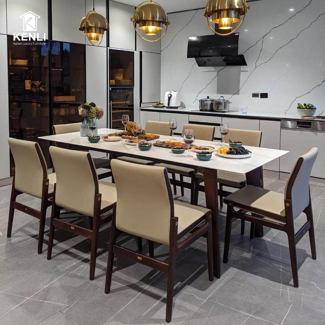 Nội thất Kenli luôn là đơn vị tiên phong cung cấp những mẫu bàn ghế ăn có thiết kế độc đáo, khẩu độ phù hợp với dáng vóc người châu Á ra thị trường. Sản phẩm sử dụng chất liệu gỗ óc chó Mỹ, gỗ sồi Nga và gỗ Teak nhập khẩu là những loại gỗ cao cấp nhất trong nội thất, kết hợp cùng mặt đá nhân tạo gốc thạch anh của thương hiệu đá Ý Santamargherita, mang đến vẻ đẹp hoàn mỹ của dòng sản phẩm dành cho giới thượng lưu.