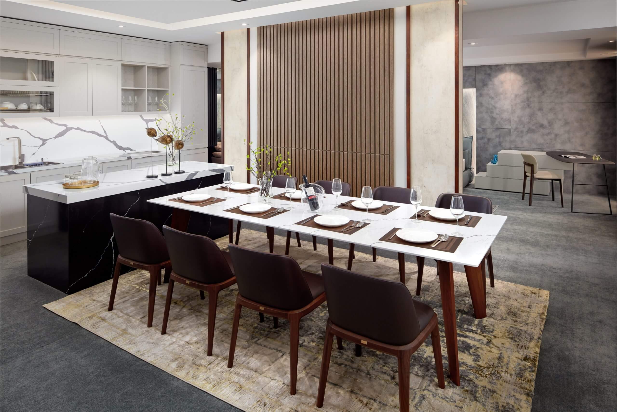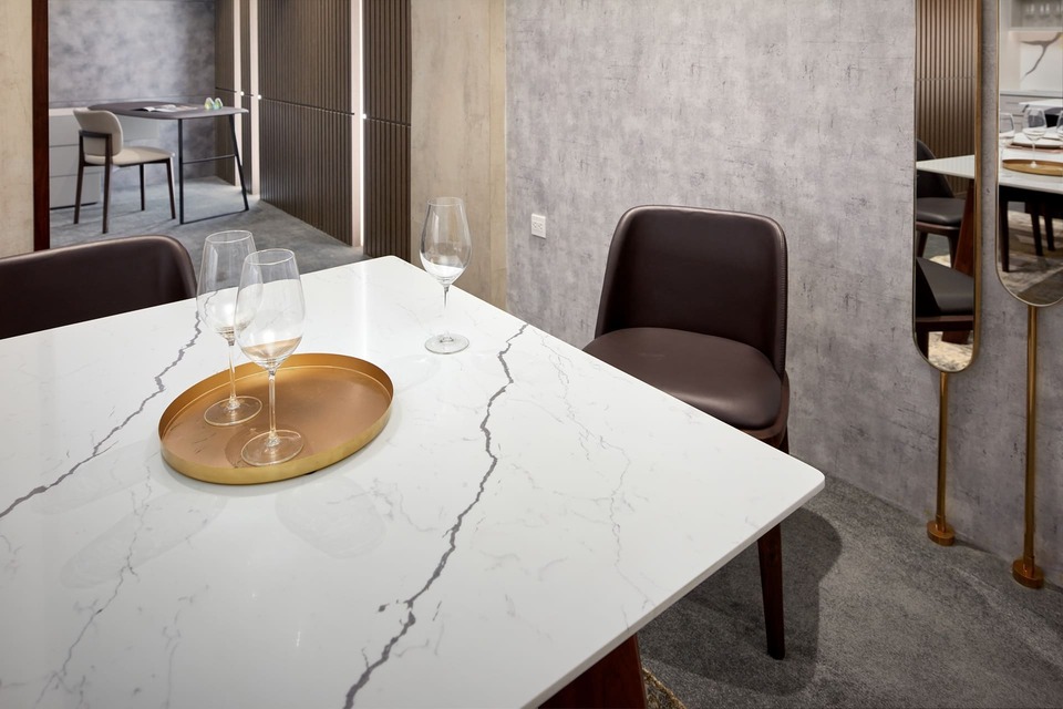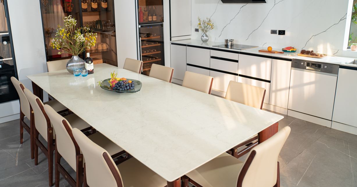 Chứa hơn 90% cốt liệu là thạch anh tự nhiên – khoáng vật có độ cứng cao nhất chỉ sau kim cương bàn ăn mặt đá Santamargherita tại Kenli có 4 ưu điểm vượt trội