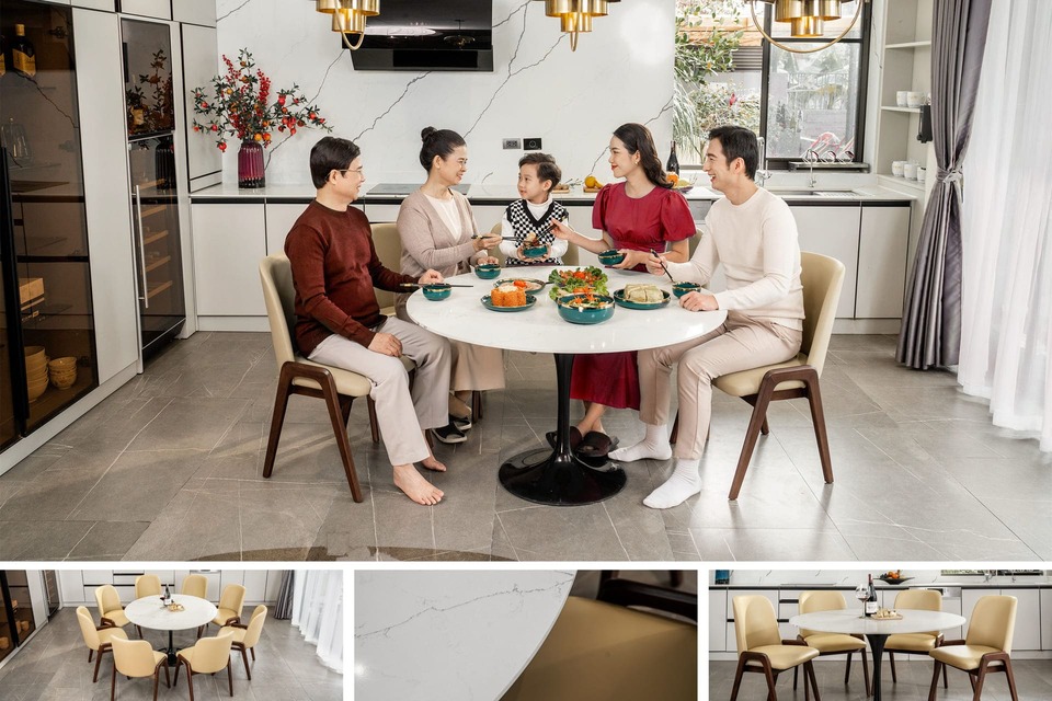 Đối với mỗi gia đình Việt, phòng bếp được xem là một trong những khu vực quan trọng nhất, là nơi cả nhà sum vầy, cùng quây quần trò chuyện và thưởng thức bữa ăn ngon. Bàn ăn đặt nơi trung tâm chính là điểm nhấn quan trọng trong không gian ấy. Chiếc bàn như linh hồn của căn phòng lưu giữ sự ấm áp, kết nối các thành viên trong gia đình lại với nhau.